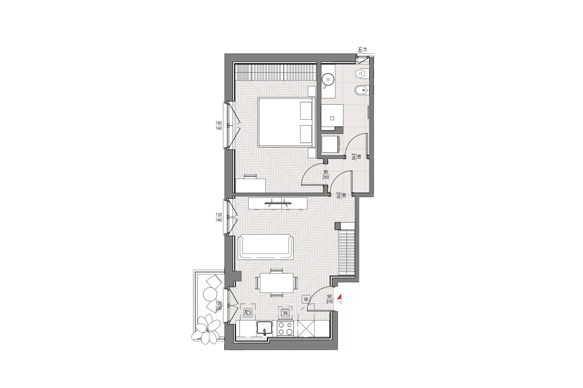 L’intervento di ristrutturazione prevede la realizzazione di un bilocale moderno e ben distribuito: ingresso su ampia zona giorno con cucina lineare, zona pranzo e area living, il tutto affacciato su balcone con vista aperta sul Borgo e sui colli.