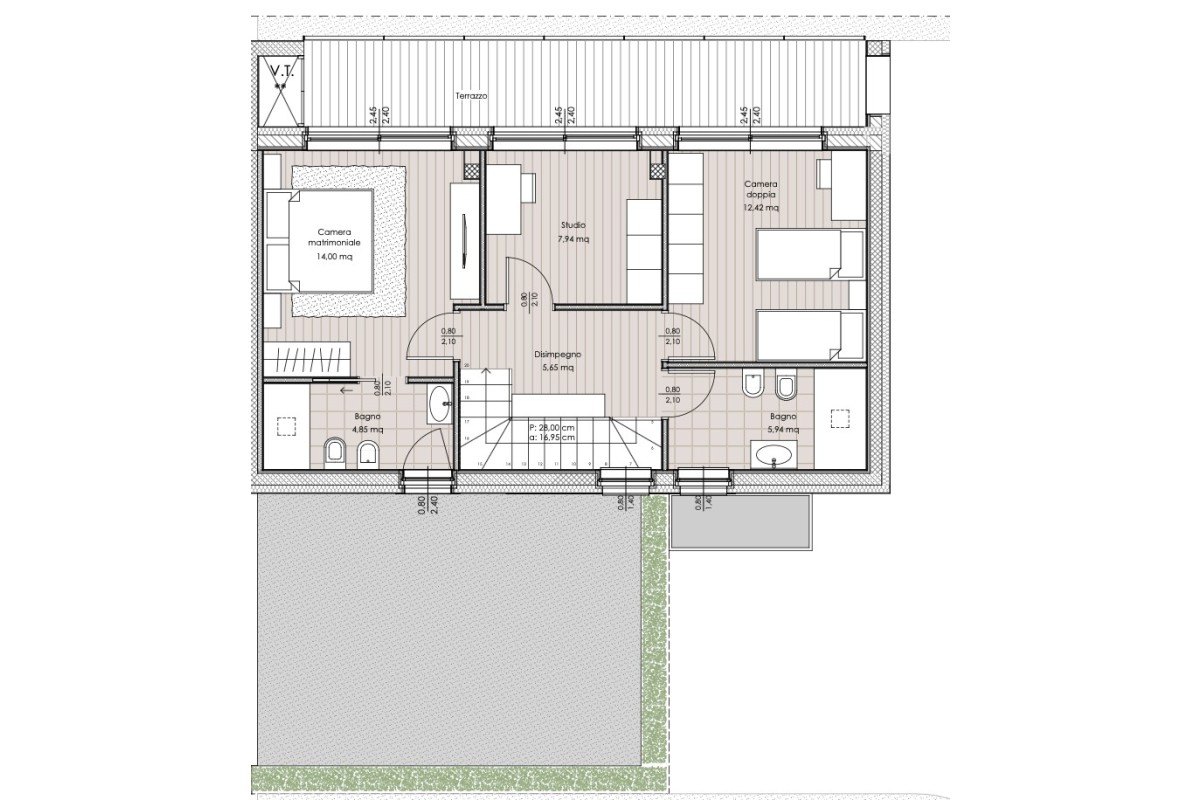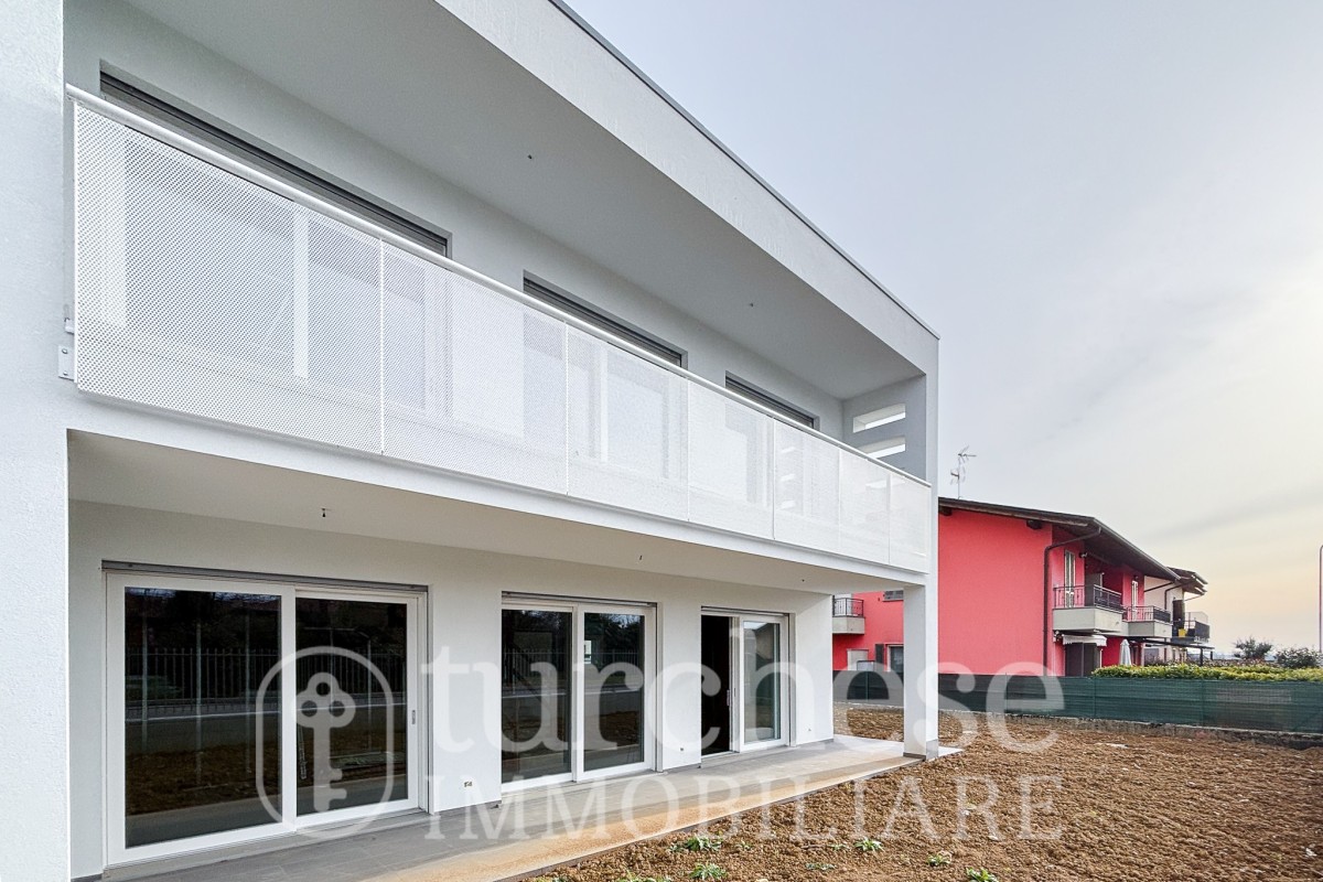 La soluzione si sviluppa su due livelli ed è così composta: al piano terra ingresso sulla luminosa zona giorno caratterizzata da ampie vetrate che affacciano sul porticato e sul giardino di proprietà, cucina a vista abitabile e un bagno di servizio finestrato, tramite comoda scala interna si accede alla zona notte composta da due ampie camere matrimoniali di cui una con bagno privato, una camera singola, ed il terzo bagno, tutte le camere hanno accesso allo spazioso terrazzo che percorre l'intera facciata.